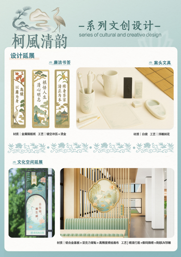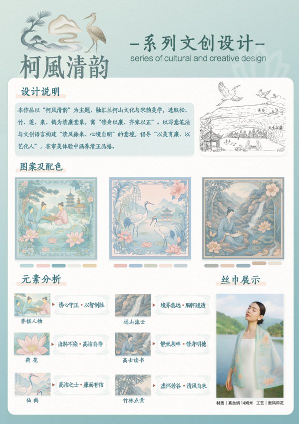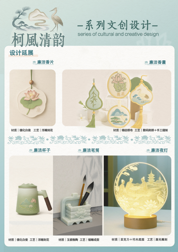 《柯风清韵系列文创设计》以“宋韵清风,廉洁文化”为核心主题,立足烂柯山传说文化与清廉意象,融合莲花、竹、山水等经典符号,生动诠释“清正、廉明、雅致”的精神品格,是学校将地方优秀传统文化与廉洁元素有机融合的创新实践。创作过程中,校纪检室全程指导,艺术设计学院党总支牵头组织王昱、付雪燕老师带领学生反复打磨作品,并联动文化馆、非遗馆等单位协同参与,形成了多方协作、共育精品的良好局面。